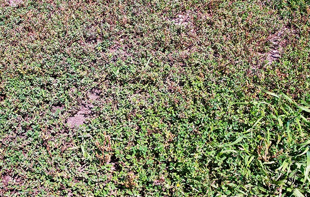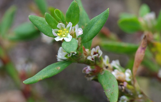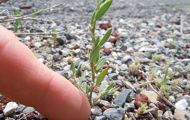 Knotweed is an annual plant commonly found in infertile compacted soil. You'll notice this plant along driveways, sidewalks and heavy traffic areas. This is a low growing, mat-like structure. The stems, housing dull blue-green leaves, grow outward from a central taproot. You may notice purple flower clusters growing at the end of stems.